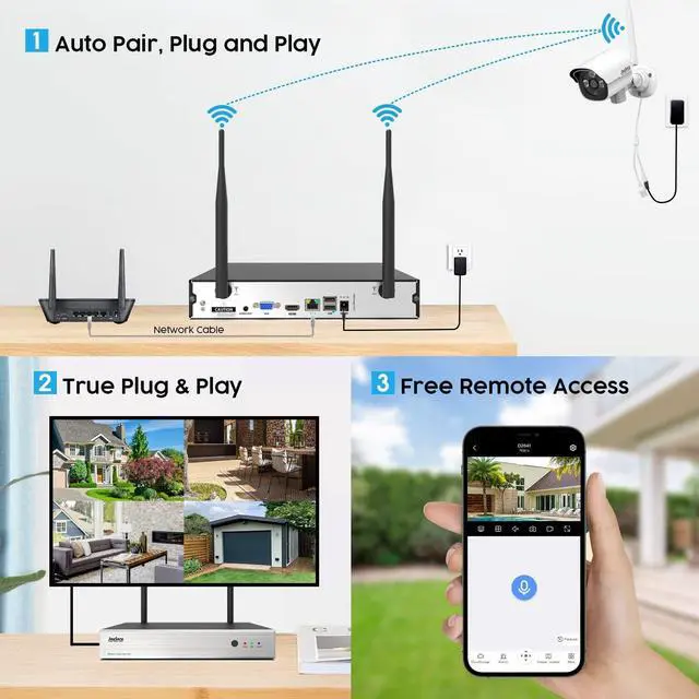 Plug & Play and Auto-PairThe IP cameras have been pre-matched to the NVR prior to shipping. No need to run video cable, Actual Plug and Play, Just need to connect the NVR and IP cameras with Power Supply. (Cameras are not cover battery) Wireless Camera is different from Wire-free camera, the power cable is still required to get electricity for 24/ 7 surveillance purposes. Wireless means that there is no video cable between cameras and NVR, easy to install. ^^ Motion DetectionWireless surveillance camera system provide to minimize false alarms. Smart notifications with app alerts will be pushed to your smartphone via iPhone/ Android App when motion is detected.