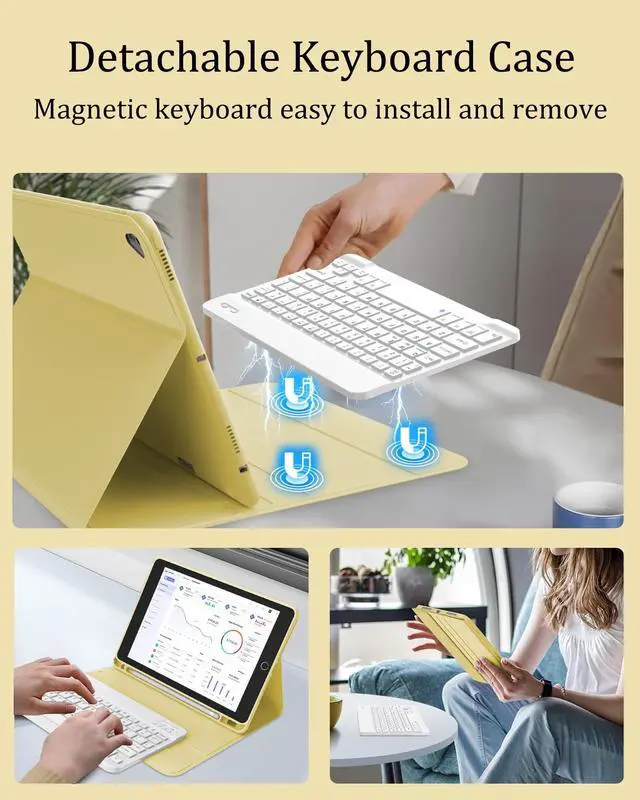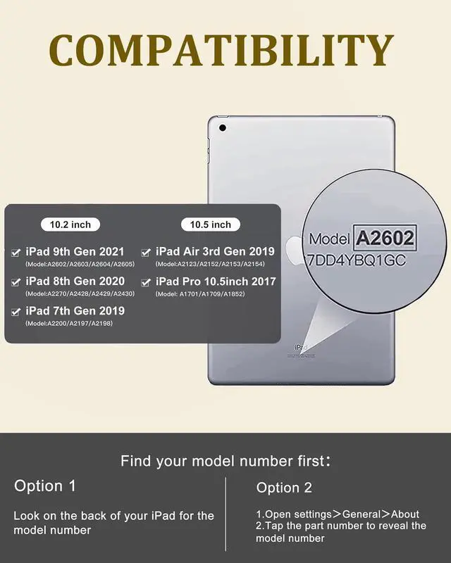 Model Number: A2602/A2603/A2604/A2605, A2270/A2428/A2429/A2430, A2197/A2200/A2198, A1123/A2152/A2153/A2154, A1701/A1709/A1852 Please check the model number starting with "A" on the back of your iPad before purchasing. ^^ Magnetic Folding Leather Case - Sturdy Premium PU cover and soft, anti-slip rubber-lined interior provides full protection for your iPad 9th Gen. Support 3 adjustable viewing angle and built in anti-slip grooves. Excellent for home, school, office, travel or business. ^^ Wireless Removable Keyboard - This iPad 8th generation case with keyboard is equipped with a magnetic, detachable, slim ( 6.5 mm), and lightweight Bluetooth keyboard. The iPad is tightly attached to the cover, making it easy to reposition and remove from the 8th generation iPad case when you reinstall and remove it. If you take our iPad keyboard case outside to work, write, breathe or play, the Folio iPad protective case keyboard provides maximum protection and productivity for your iPad in the smallest size. ^^ Stable Bluetooth Connection - Convenient and fast Bluetooth connection allows you to use the keyboard anytime, anywhere. Its key is quiet and comfortable. The iPad 7th generation case with keyboard has a power-saving mode, which will enter sleep mode if not used for a long time.