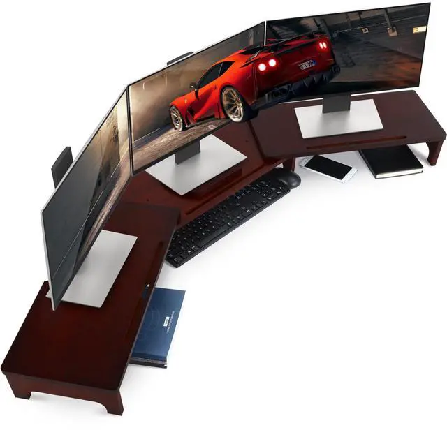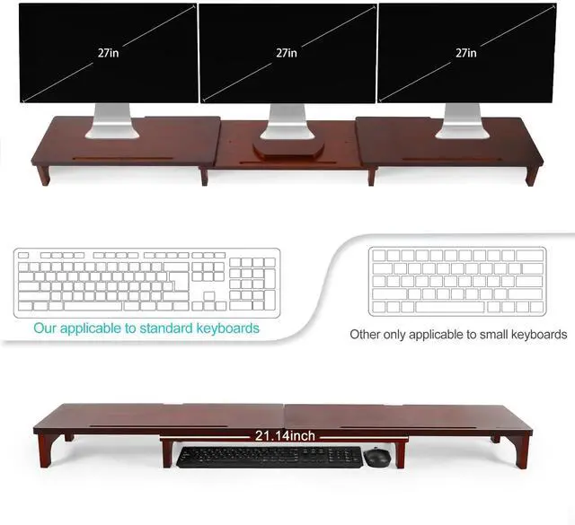 Helping you organize the desk reasonably, and find the most comfortable posture during long-time work, ease your neck and back. ^^ Large Size Desktop OrganizerThe monitor stand for 3 monitors dimension of each shelf surface is 21.7 inx 9.8 in. There large space for stowing a keyboard and a mouse underneath. This desktop organizer is suitable for using in the office/home study or those people who have a spacious working station. ^^ Real Solid Bamboo MaterialThis desk shelf for monitor organizer is made of bamboo (you may call it wood). Bamboo features durable and sturdy.