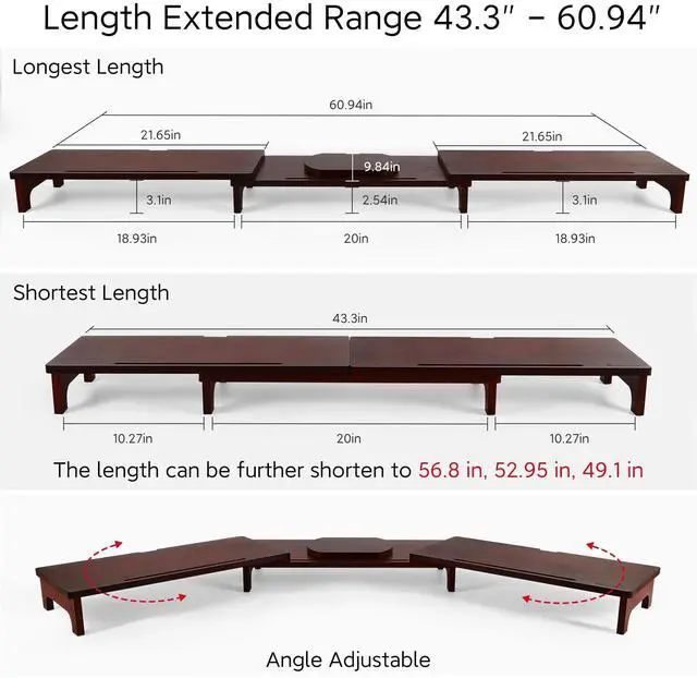 Triple Monitor Stand for DeskThe three monitor stand is built up with 3 shelves, which can hold three 27" computer monitor. Much space is available for matching multiple devices - PC/laptop/printer/books. You can also set up the desk as your need. ^^ Screen riser with Adjustable Length & AngleThree fix holes for adjusting the length. The minimum and maximum length of the monitor riser is about 43.3 in and 60.7 in. The angle of the left and the right shelf can be adjusted according to the desk corner construction and the size of computer screen.