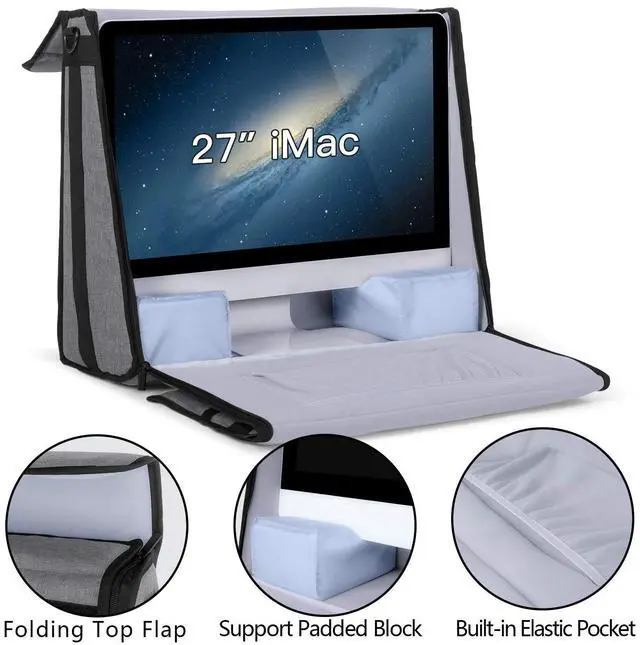 Specially designed to compatible with Apple* iMac* 27'' Desktop Computer. ^^ Support padded foam block to ensure your computer remain stationary. Adjustable panel reinforcement offer additional screen protection. ^^ The padded handle and adjustable shoulder strap can lighten the burden when carrying computer work on the go. ^^ Made of high quality and premium nylon material, keeps your iMac* away from dust, dirt and scratches. ^^ Built in many pockets for iMac* accessories, such as keyboard, mouse, track pad, and cables. (*Our Product is unrelated to brand referred)