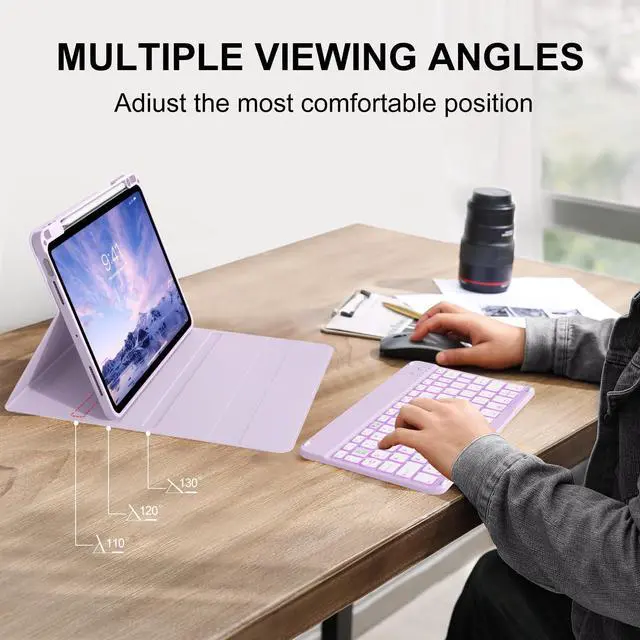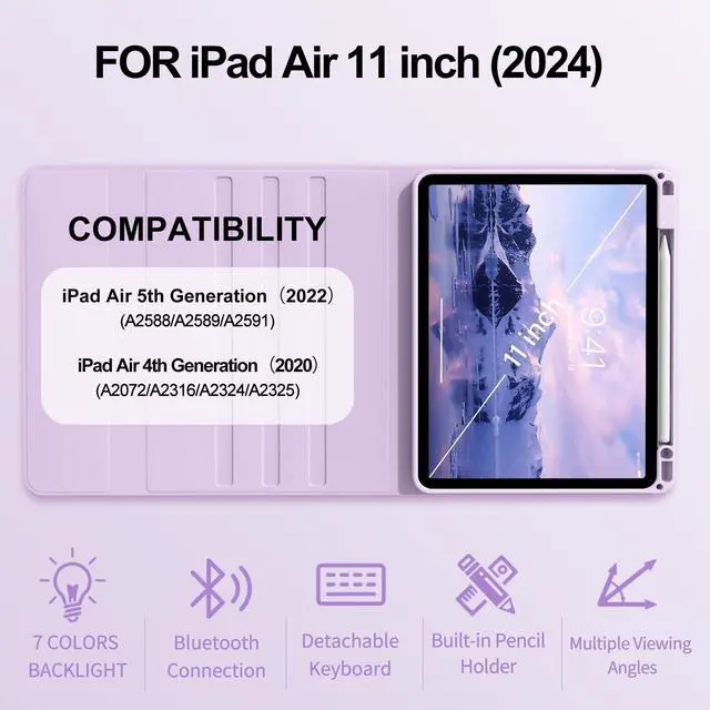 Number: A2588/A2589/A2591, A2316/A2324/A2325/A2072). It is not compatible with any other devices. Please check back bottom of your iPad to find the model number. ^^ 7 Colors Backlit Keyboard & Detachable CaseFor iPad air 11 inch case with keyboard has 7 colors backlit, you can choose the color you like and type smoothly even in the dark. The mechanical scissor keys have a rebound function to reduce noise and are comfortable even for long typing. The case has magnetical strip to adsorb the keyboard, avoid the keyboard move aournd. ^^ Three Viewing AnglesFor ipad Air case with keyboard has 3 grooves to adjust the viewing angle and it can keep your iPad more stable in the groove, which makes your iPad work like a laptop, more convienient for working, typing or watching videos. ^^ Long Life Battery Rechargeable KeyboardThe wireless keyboard for iPad Air 11 inch built-in 400mAh premium Li-ion battery with energy-saving mode. Faster charging with Type C connector for keyboards, about 2-3 hours full charge, work for at least 180 hours. Perfect for home, office or school use, convenient for studying and working on the go.
