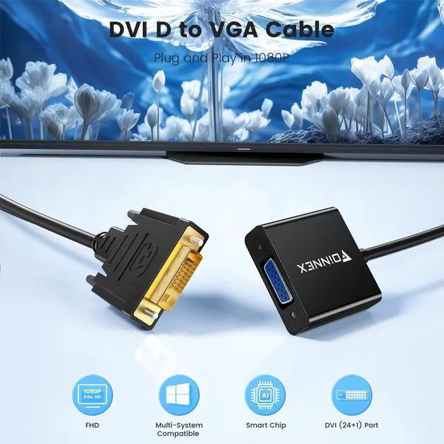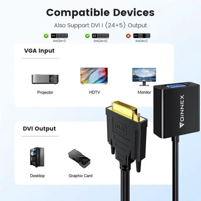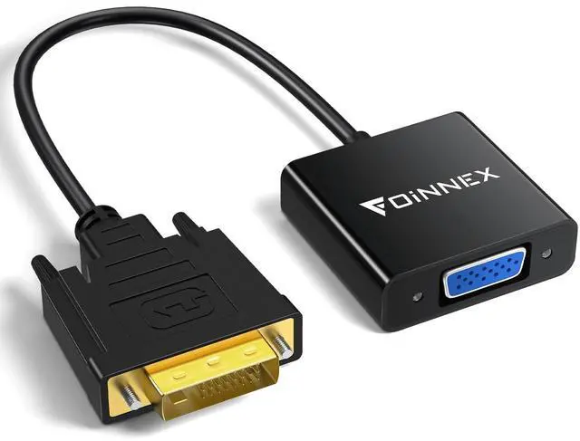Note: VGA extension cable not included. ^^ Wide Compatibility DVI male VGA female connector supports source devices with DVI-D output, like graphics cards and laptops, connected to display only has VGA input, like monitor, TV, and KVW. ^^ Stable Connection in 1080P With secure screws and a sophisticated chip, DVI to VGA 15-pin converter provides you with a stable connection and clear signal. Supports max resolution 1080P@60Hz offering you great picture quality. ^^ Plug and Play Foinnex DVI cable for VGA screen is easily installed, plug and play with no external driver required, quick connection.