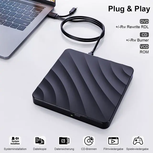 ^^ Plug & Play: The CD / DVD burner is powered via the USB port. No additional power supply required. Simply connect the CD / DVD drive externally to your computer and it will be recognized. You can burn files, install software and create backup CDs. With this external optical drive you can watch DVD/CD movies instantly and burn music and movies to disc.