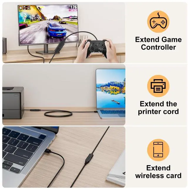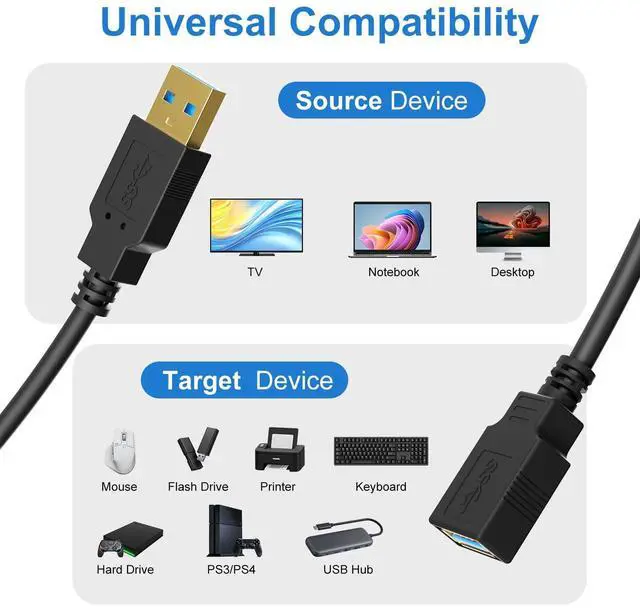 USB 3.0 Extender Cord features Corrosion-resistant copper plated conductors, gold plated connectors, aluminum foil shielding and PVC housing construction. 5Gbps High Speed Data Transfer Rate USB Extender Cabl More stable cable transmission and less signal loss. Connect the Male to source device such as laptop, computer, smart TV. Connect the Female to target device such as mouse, keyborad, printer, hard disk, webcam, PS4, VR. while maintain backwards compatibility with your existing USB 2.0 devices.