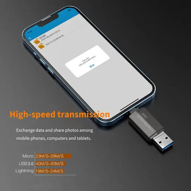iPhone USB Flash DriveThis photo stick for iPhone helps alleviate being at full storage with 128GB. You can take more pictures and videos, and download more music, games and apps. Using this iPhone memory product, there is no worries, no problems with the iPhone storage any more. ^^ High-speed transmission The 128GB Mobile Thumb Drive with USB 3.0 port allows high-speed & stable transfer compatible with large files. Transfer Speed of USB Flash