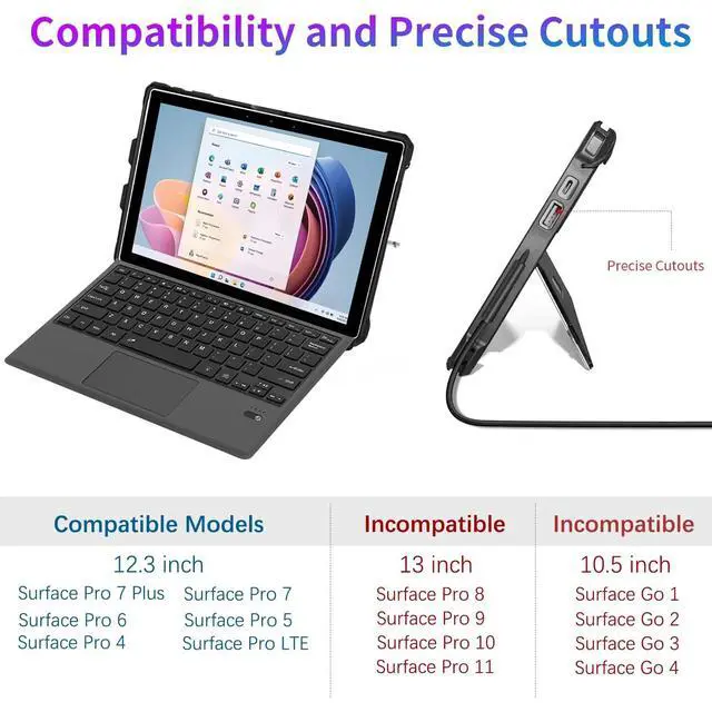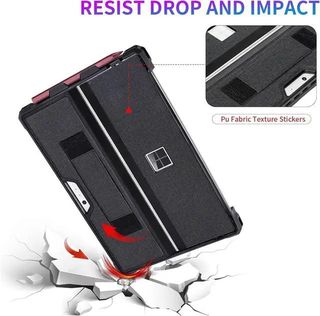 CompatibilityThis case is perfect for the Microsoft Surface Pro 7 Plus (2021), Pro 7 (2019), Pro 6, Pro 5, Pro 2017, Pro 4, and Pro LTE 12.3 -inch Windows tablets. ^^ Drop Protection This case is made of thickened Shock-absorbing soft TPU and sturdy polycarbonate. Moreover, Pu Fabric texture stickers are used, which feel better than ordinary protective covers and can resist daily impact without worrying about damaging the Surface. ^^ Functional Handstrap This case has a soft silicone handle on the back for easy carrying, and an extra non-slip elastic strap on the corner to keep the type keyboard folded securely while you're on the go.