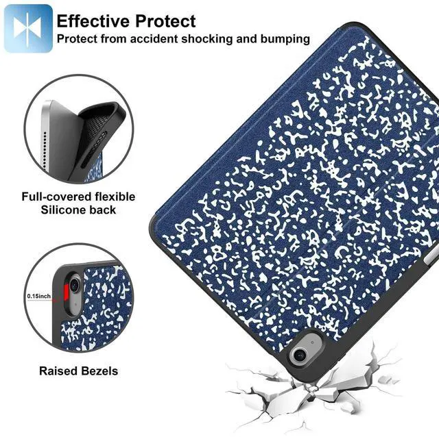 ModelsComposition notebook iPad case designed for new iPad (A16) 11th generation 11 inch/10th generation 10.9 inch released in 2025/2022. Not compatible with other iPad models(ipad 10.2 9th/8th/7th Gen) ^^ MaterialMade of flexible silicone back & TPU cover, iPad (A16) 2025/2022 case provides full protection against shocking & scratching for your new iPad 11th/10th generation 2025/2022 ^^ Multi anglesAnti-slip front stand shell (Not trifold) creates different angles for viewing or typing; magnet secures the iPad 11th/10th generation case closure, easy to snap on and off ^^ FunctionBuilt-in pencil holder makes iPad 11th/10th generation 2025/2022 case convenient to carry and better protect your Pencil.