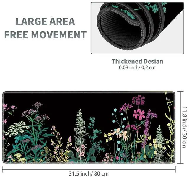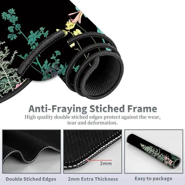 ^^ Natural Rubber Base The soft and dense non-skid nature rubber base keeps this oversize desk pad firmly in place. This long mouse mat remains uniformly flat even over imperfect surfaces. Just immerse your work or games without worrying about the annoying mouse pad movement. ^^ Edge Banding Desgin The full desk mouse pad Sewing frame ensures no friction or sagging. The edge trim design prolongs the service life and prevents the narrow top strip from leaving the base. Reinforced edges prevent deformation or damag ^^ Washable Design Desk Pad A spill-proof coating makes liquids slide right off the surface.