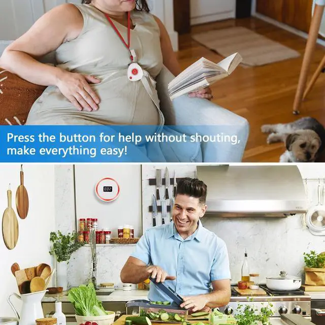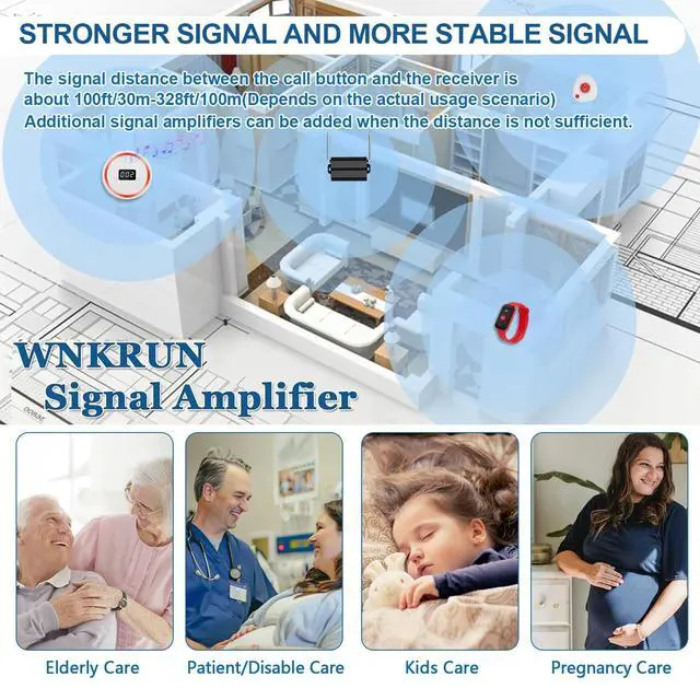 And the signal range of the alert system is about 328 feet (The actual distance depends on the application scenario) ^^ The call button can be stuck on the wall or hung around the neck. The watch call button can be directly worn on the wrist and can meet all your wearing needs. When seeking help is needed, just press the button and the receiver will play a beautiful melody set in advance ^^ Wireless Caregiver Pager is widely applied in home, hospital wards, nursing homes, churches, hotels, and rehabilitation centers.