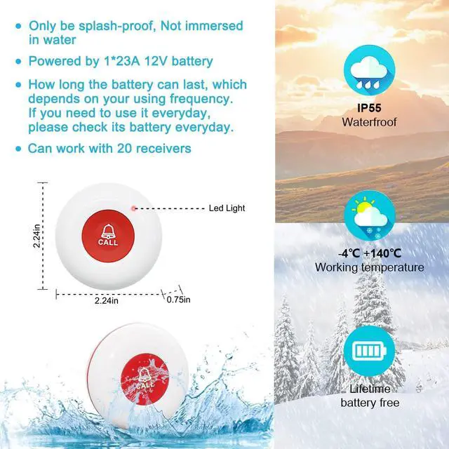 When the call button is pressed, it is portable The receiver will ring and vibrate and flash ^^ [Easy to install and use] The alert button can be hung on the chest or anywhere in the house, and can be fixed on the bedside with double-sided tape, or used as a doorbell, with a single tap, without yelling Can attract attention, vibration receiver can remind people with poor hearing, especially the elderly to take care of each other ^^ [Waterproof transmitter] You can use the transmitter call button during meal/soup splashing. And can be installed in the bathroom, can be placed in a pocket, can also be hung around the neck as a pendant or fixed at the head of the bed/toilet.