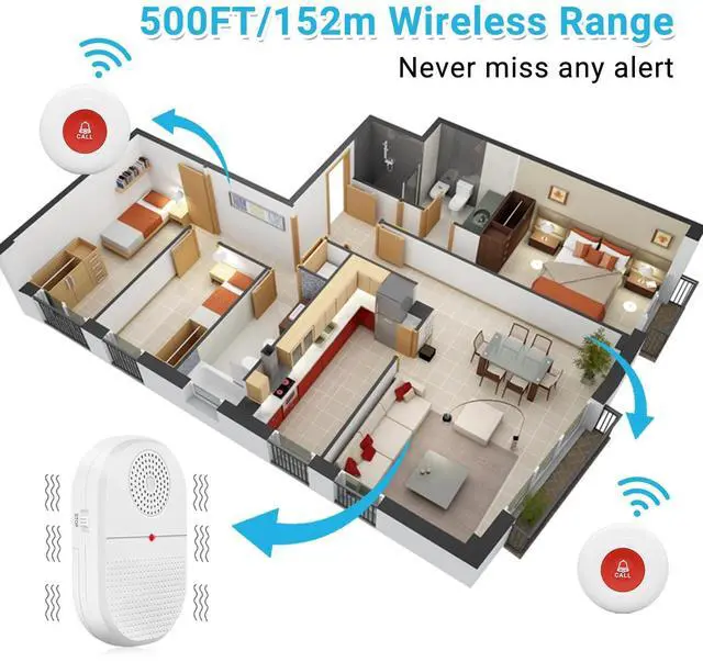 Including fixed bracket and double-sided stickers ^^ [Wireless Nursing Pager] 4 kinds of ringtones, 5 kinds of volume levels from 0dB to 110dB are available. The operating range in the open area is 500 feet, ensuring that you will not miss any calls for help, ideal for those in need of care