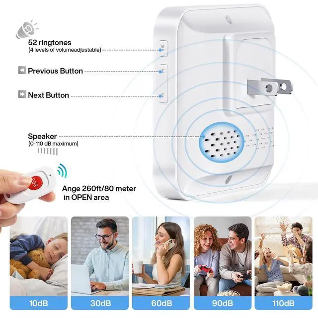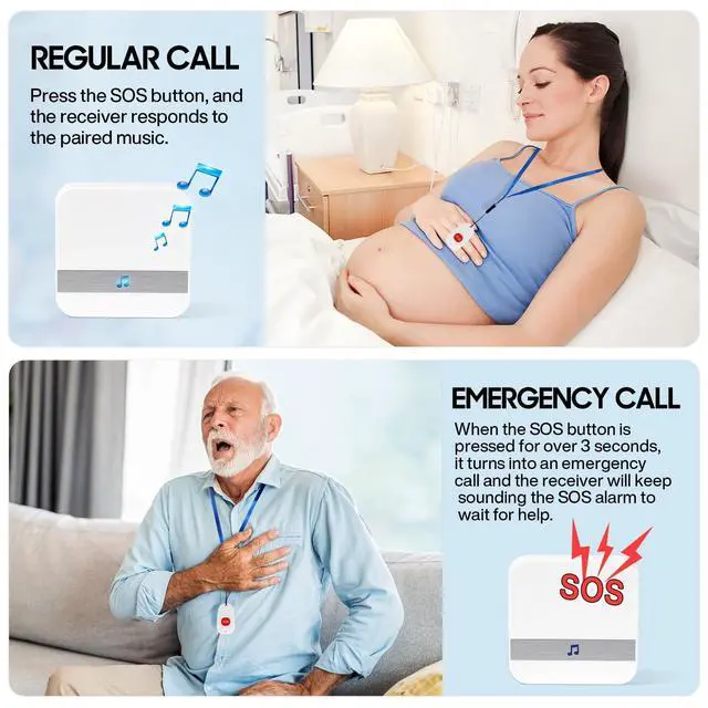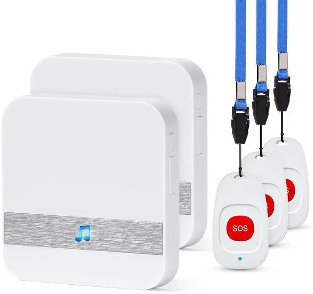 Wireless Caregiver Pager Nurse Alert System---DoubleCare alarm system for home Smart Call Button for Home/Pregnant woman/Elderly/Patient Vibration Pager (life alert necklace) 3 Emergency Transmitter + 2 Feet Plugin Receiver. ^^ 52 Music & 4 Levels of Volume Receiver --- Wireless Caregiver Pager Call has 60 Ring Tones for Your Choice. Operating Range is about 262 Feet / 80 Meter in open Area. 4 Level Adjustable Volume From 0db to 110db. Easy Use ( Plug and Play) Plug the Receiver into an Electrical Outlet. ^^ SOS Life Alert Necklace Button IP55 Waterproof & Neck Strap Included---Transmitter/Push Call Button is Easy Carry, It can Be Put in Pocket, Or Hang on neck as Pendant.
