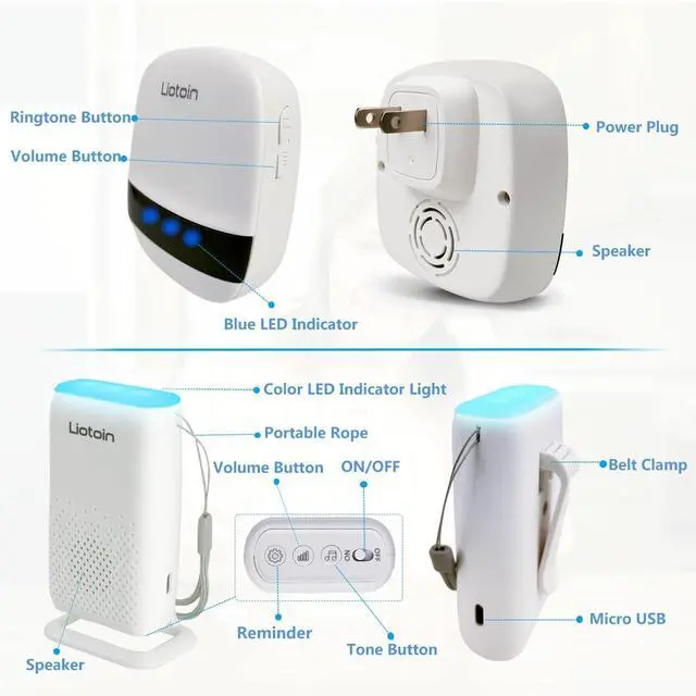 ^^ Multifunctional call bell: The portable caregiver pager is equipped with a belt clip and can be carried with you. It includes five adjustable reminder modes of vibrating flash, 58 ringing tones to choose from, and four adjustable volume levels (from 25db to 90db). The plug-in caregiver pager is plug and play, with 36 ringtones for you to choose from, 5 adjustable volume levels (from 0db to 110db).