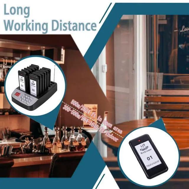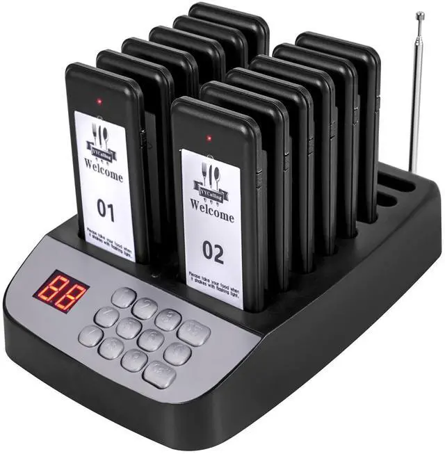 YYCALLING Wireless Calling SystemBased on 315MHZ radio-frequency, the indoor transmission distance is 984-1640 feet, and the open area can transmit up to 3280 feet/1000 meters, which can effectively reduce close contacts and provide better safety protection measures for your employees, customers and patients. ^^ Calling Modes2 modes for restaurant paging system are vibration + flash + buzzer and vibration + flash, meeting different occasions. ^^ Rechargeable Battery 12 charging slots provide power whenever you put the pager into the base, so you don't have to worry about running out of power.