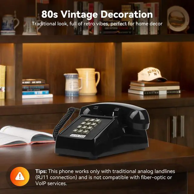 ^^ BACKUP EMERGENCY TELEPHONE: This analog phone can work well with different telephone system without External Power, just need plug the telephone line into line port, great as a Backup Emergancy Phone for power outages. ^^ VINTAGE DECORATIONThis traditional retro classic landline phone will be a great choice for home, cafe, school, restaurants, hospitals, retail stores and office, which makes a strong ambience of fashion nostalgia.