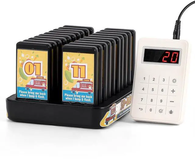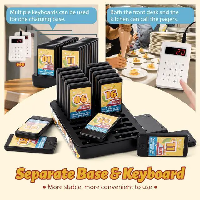 Upgraded Split Design20 Pagers The standout feature of this restaurant pager system is its independent keyboard, which separates from the charging base. This design allows for greater flexibility and application in various settings with minimal limitations, enhancing cost-effectiveness. Multiple keyboards can be paired with a single charging base, significantly boosting service efficiency. With a set of 20 pagers, this system is ideal for diverse occasions. ^^ Extended Transmission Range Our restaurant pagers offer an impressive range of up to 328 feet indoors and, 3280 feet outdoors. Please note that the actual transmission distance may vary slightly depending on wall materials.