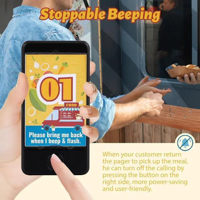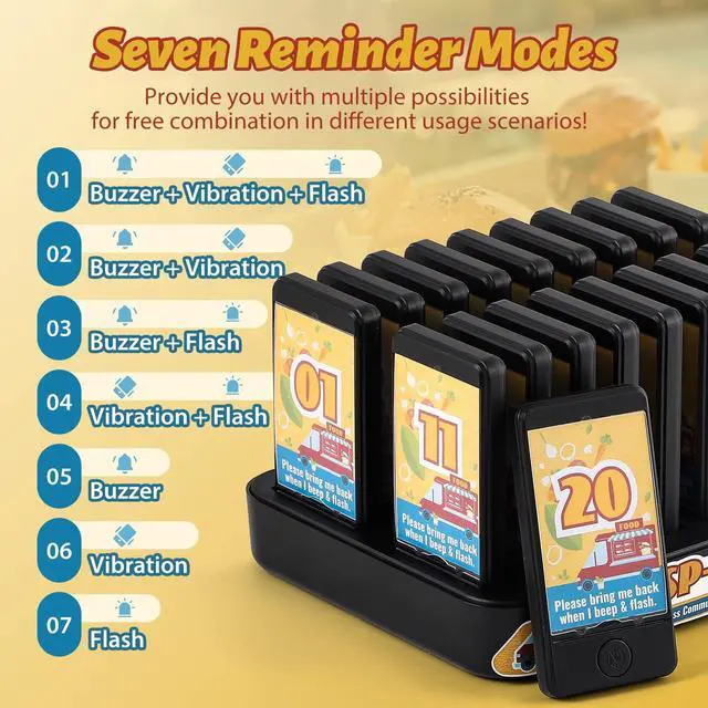 ^^ Seven Alert Modes Choose from seven customizable alert modes: 1) Buzzer + Vibration, 2) Buzzer + Flash, 3) Vibration + Flash, 4) Buzzer + Vibration + Flash, 5) Buzzer Only, 6) Vibration Only, and 7) Flash Only. These combinations provide versatile options tailored to different usage scenarios, ensuring you find the perfect fit for your needs. ^^ Customizable Advertising Inserts & Individual Pager Sales The plastic covers on the pagers allow for easy replacement of the cards inside. We highly recommend customizing these inserts with your branding to enhance visibility and professionalism. ^^ User-Friendly Beeping ControlCustomers can easily silence the pager by pressing the button located at the bottom center when returning it. This feature not only saves power but also enhances the user experience. ^^ Adjustable Reminder DurationThe wireless calling system allows you to set the alert duration anywhere from 0 to 250 seconds. Setting it to 0 means the pager will continue notifying until manually turned off (factory default: 10 seconds). You can adjust the duration to meet your specific requirements.