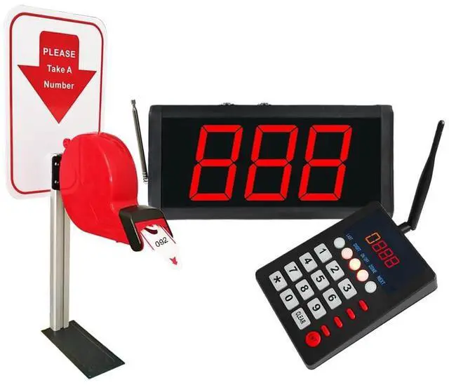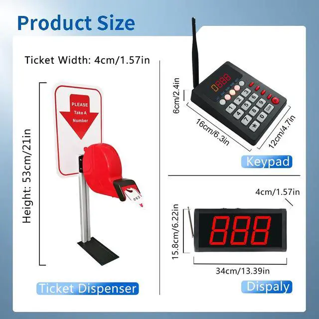 Package Includes: 1 x Keypad Pager1 x Number Display Receivers1 x Ticket Dispenser Stand2 x Power Adapter1 x User Manual