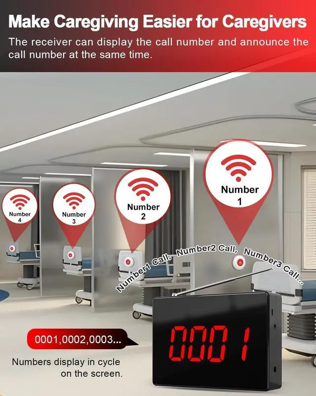 UPGRADE: The upgraded wireless calling system displays and voice announces the call number, making it easier to identify which room requires attention. Additionally, you can set the alert to repeat multiple times instead of the usual single beep, so patients or dont need to press the nurse call button again to get attention. ^^ EXPANDABLE TO 1000