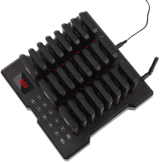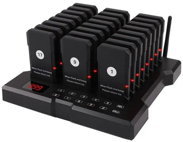 OUTSTANDING PERFORMANCE- The restaurant pagers system consists of one 998 channel wireless touch keypad transmitter and 24pcs pagers. Customers don't have to wait in line, keep social distance, and improve work efficiency. Keyboard can beep when pressed. ^^ 7 PROMPT MODES- Shake+flash+buzz, shake+flash, flash+buzz, shake+buzz, shake only, buzz only and flash only. Widely used in restaurants, hotels, hospitals, churches and cafes. ^^ DIGITAL CONTROL & DISPLAY- Equiped with a large LCD screen display for easy operation and precise control. With a logo display area in front, you can place your store image, name, or other advertisements.