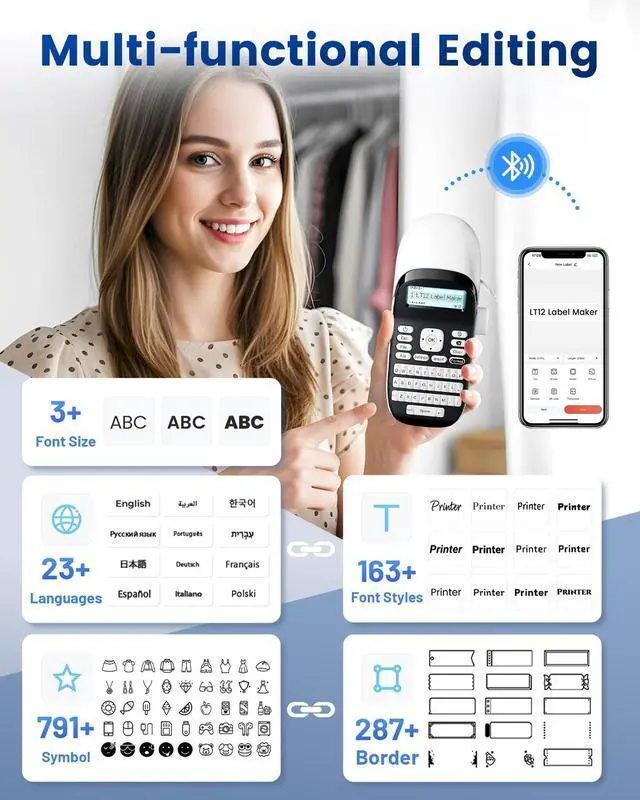 • LCD Screen Visualization: Handheld label makers have newly upgraded LCD backlit screens, which are clear and easy to read in both dim and bright environments. Download the "Print Master" app, connect your phone to get 1600+ icons, 1000+ emojis, 163+ fonts, 30+ languages and 287+ border styles. Save te