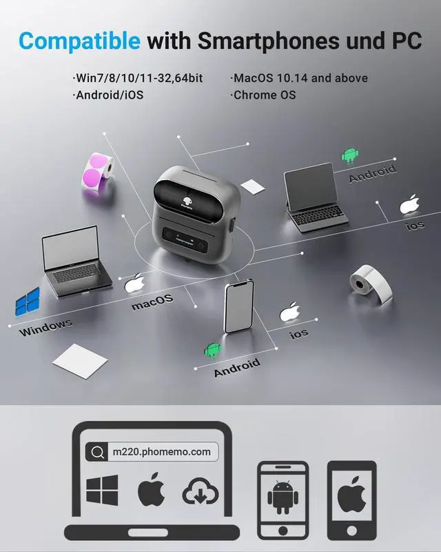 High Compatible - M220 label maker not only compatible with Android & iOS Phone and tablet but also compatible with Windows 10/11 and Mac laptop & PC, it is a mobile label maker also a small desktop label printer