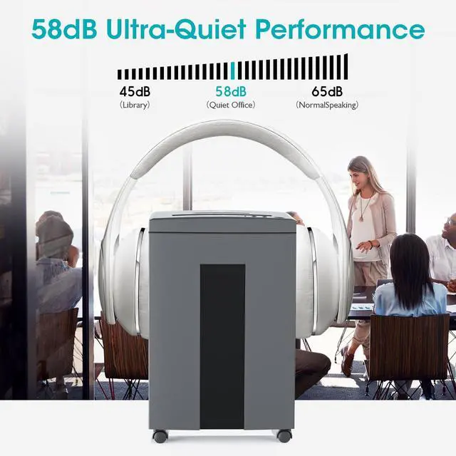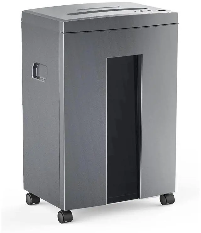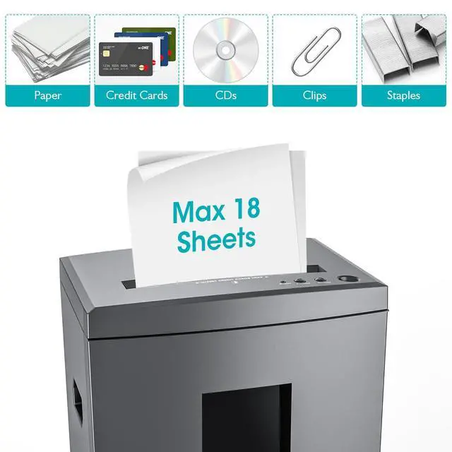 Secure Cross-Cut ShreddingCross-cut security level P-4 to secure confidential information. Shreds max 18-sheet paper/staples/clips into particles measuring 5/32" x 1-3/8" (4mm x 35mm); also shreds CD and Credit Card. The blades will cut each disc into three pieces. This crosscut paper shredder is ideal for any home office or commercial setting. ^^ Extended Running TimeContinuous running time upto 60 minutes supported by a patented cooling system, making it a reliable paper shredder for home use and heavy-duty applications in home offices or industrial environments. ^^ Ultra-Quiet PerformanceLow noise level 58dB ultra-quiet performance; 6 gallons pull-out waste bin with large easy viewing transparent window.
