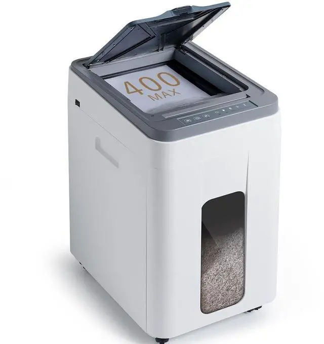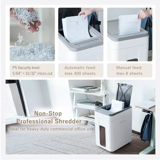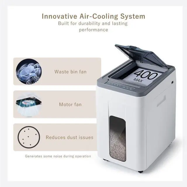 AutoFeed & P5 Micro-Cut Security: High-volume paper shredder processes 400 A4 sheets continuously (30 mins runtime) via auto feed inlet, while manual slot handles 8 sheets at once, also shreds staples and cards. P5 micro-cut (5/6415/32) complies with DIN P5 standards, this document shredder ensures confidential data protection for heavy duty home office, bank, company and school office use. ^^ Non-Stop Dual Cooling & Industrial Motors: Dual-fan cooling featuring both motor and waste bin prevents overheating during continuous shredding. Manganese steel blades and Heavy-duty commercial-grade motor deliver jam-proof operation with low noise, ensures long-running professional shredding for busy commercial, industrial and large home office use ^^ Large Wheeled Bin with