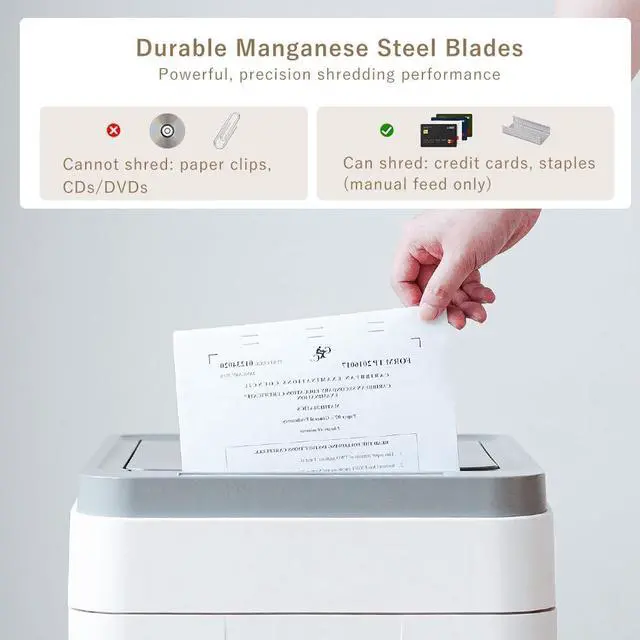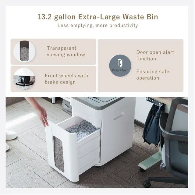 Smart Alerts: This large paper shredder for home with smart alerts features a 13.2 -gallon pull-out bin with casters, including bin-full/door-open indicators. Mobility wheels with front brakes simplify disposal, while the high capacity reduces emptying frequency for heavy-duty shredding. Designed to shred paper, credit cards, letters, mail, and staples (via manual slot only), excluding CDs, DVDs and clips. it stands as the ultimate business shredder for home offices, law firms and enterprises. ^^