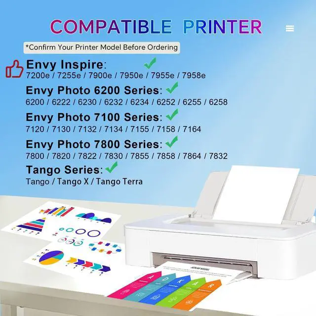 ^^ Compatible Printers: 64xl ink cartridge for hp printers Envy Photo [ENVY Inspire Series] 7200e, 7255e, 7900e, 7950e, 7955e, 7958e [6200 Series] 6220, 6222, 6230, 6232, 6234, 6252, 6255, 6258 [7100 Series] 7120, 7130, 7132, 7134, 7155, 7158, 7164 [7200 Series] 7230, 7272, 7275 [7800 Series] 7820, 7822, 7830, 7855, 7858, 7864, 7832 [7900 Series]7975 / 7978 [Tango Series]Tango / Tango X / Tango Terra ^^