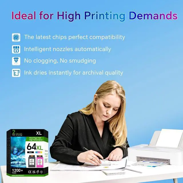 Included Items: 64XL ink cartridges (64 XL black ink cartridge-1pk, 64 XL color ink cartridge-1pk). Specifically designed for printers, aiming to achieve a perfect balance between efficiency and cost control.