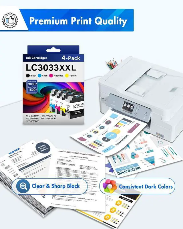 Seamless Performance: With simple plug-and-play installation, these cartridges are easy to replace and provide a smooth, hassle-free printing experience. Whether youre a beginner or an experienced user, the LC3033XXL 4PK ensures long-lasting and consistent performance with every print