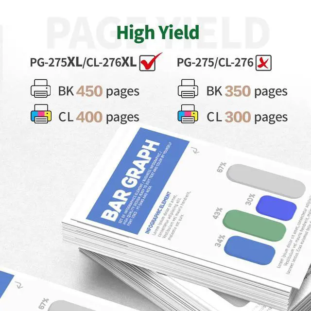 High Yield: PG-275XL black ink cartridge is up to 450 pages per cartridgeCL-276XL black ink cartridge is up to 400 pages per cartridge at 5% coverage (letter/A4) ^^
