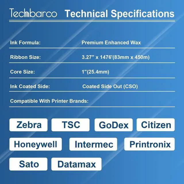 [Typical Applications in Label Printing] Perfect for shipping addresses, warehouse shelf tags, inventory management, product identification, garment labels, manufacturing parts identification, and medical/ pharmaceutical labels ^^ [Optimized for Paper Labels] Designed for optimal performance on coated, glossy, semi-gloss, and matte paper labels. The formulation provides reliable adhesion to resist smudging during normal handling on these materials ^^ [Universal Printer Compatibility] This 83mm x 450m ( 3.27" x 1476') ribbon with 1" core ensures wide compatibility with industrial printers including Zebra, TSC, Honeywell, Intermec, Printronix, GoDex, Citizen, Sato, and Datamax ^^ [Clear & Reliable Print Quality] Achieves high first-time scan rates with sharp, high-density prints and offers improved durability over standard wax, keeping labels legible in demanding workflows ^^ [Protects Your Printer] Features an anti-static back coating that helps minimize carbon dust to help protect the printhead from abrasion.