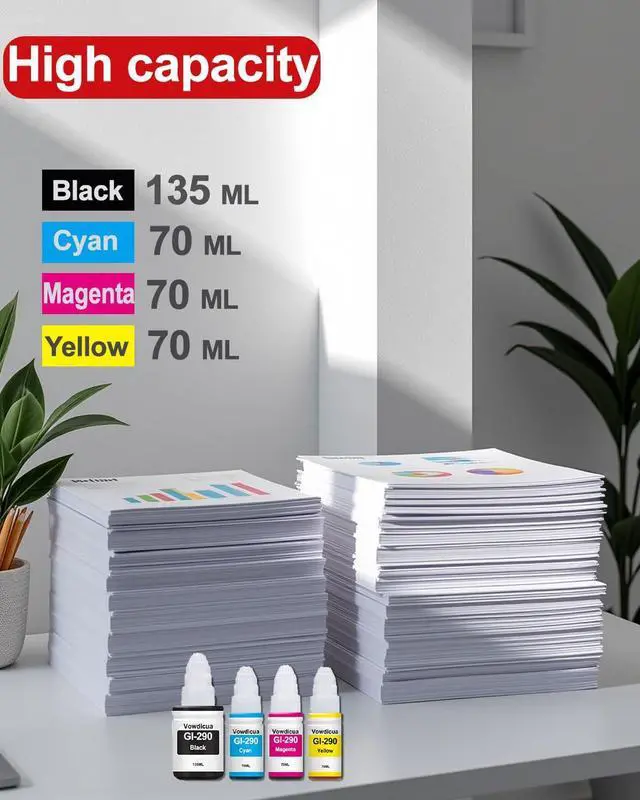 High Capacity: 135ML per gi-290 black ink bottle and 70ML per gi-290 color ink bottle ^^