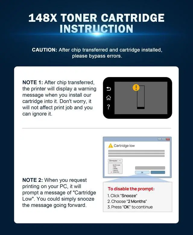 ^^ Warm Tip: You may receive error message such as "Cartridge Low" or "Used or Counterfeit Toner Cartridge Install" during printing. It would not affect printing, please ignore it or click OK and continue to use toner. ^^ NotePlease follow our pictures and video to get the guidance for switching chips. If you meet any problem with installation, please reach our engineer via for assistance ^^