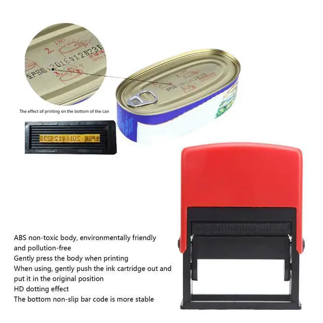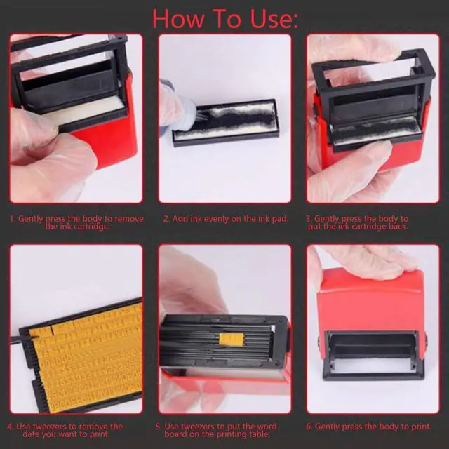 To Use: 1. Gently press the body to remove the ink cartridge. 2. Add ink evenly on the ink pad. 3. Gently press the body to put the ink cartridge back. 4. Use tweezers to remove the date you want to print. 5. Use tweezers to put the word board on the printing table. 6. Gently press the body to print.
