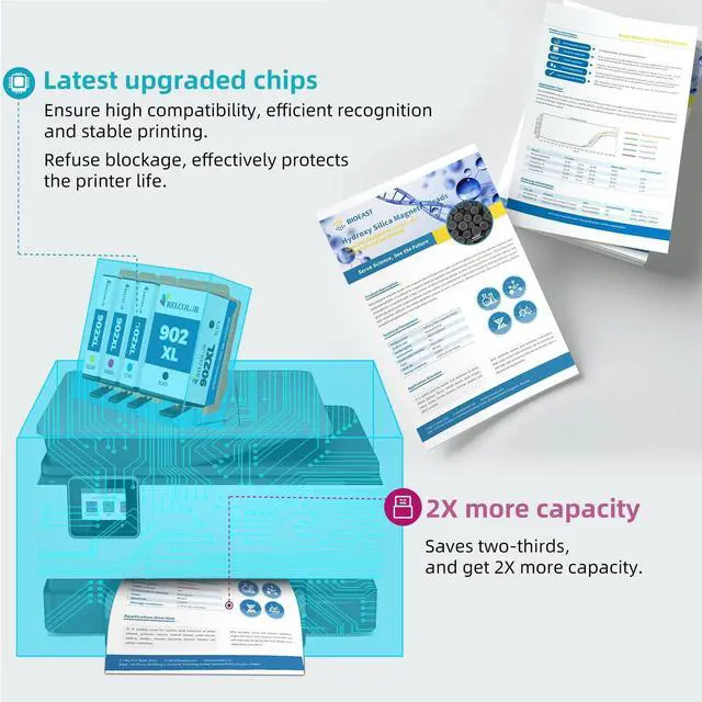 Vibrant & rich printing: All Relcolor 902 ink refilling with high-quality and harmless raw materials: premium ink and recycled plastic - with more capacity, delivering you impressive printouts meanwhile protecting your printer and the environment (Approved by CE, REACH, ISO 9001, ISO 14001 and ISO 14067 certificate) ^^ 902 XL ink cartridge yield (approx. )