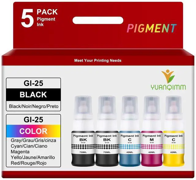 Package: 5 pack Replacement for canon GI25 GI-25 refill bottles combo pack, 1 x 70ml GI-25 black ink, 1 x 40ml GI-25 cyan ink, 1 x 40ml GI-25 magenta ink, 1 x 40ml GI-25 yellow ink