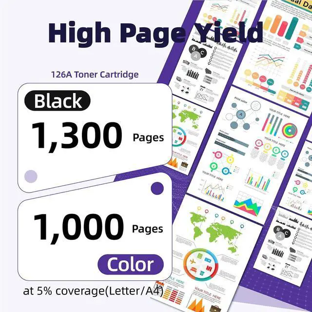 ^^ High Page Yield: 1, 300 pages 126A CE310A black toner and 1, 000 pages 126A CE311A CE312A CE313A per color toner (5% coverage on A4 paper).