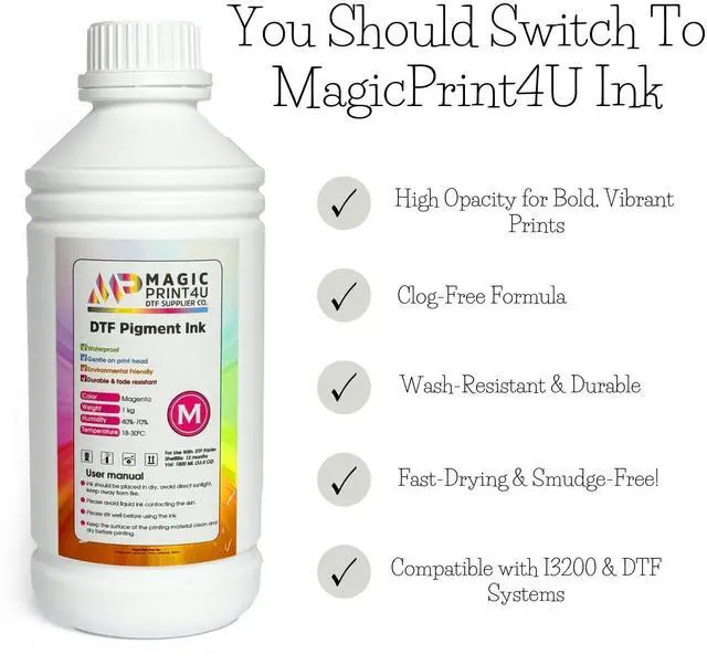 • PROFESSIONAL-GRADE PRINTING MagicPrint4U DTF Ink delivers high-volume, high-resolution prints with precision. Developed for direct-to-film workflows, each 1000mL bottle ensures uninterrupted production with rich, consistent output.
