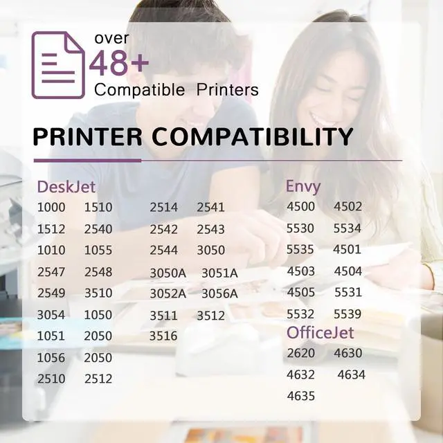 Compatible Printers: HP Envy 4500 4501 4502 4503 4504 4505, Envy 5530 5531 5532 5534 5535 5539, OfficeJet 2620 2621 4630 4632 4634 4635, DeskJet 1000 1010 1012 1050 1051 1055, DeskJet 1056 1510 1512 2000 2050 2510, DeskJet 2512 2514 2540 2541 2542 2543, DeskJet 2544 2646 2547 2548 2549 3000, DeskJet 3050 3054 3510 3511 3512, DeskJet 3050a 3051a 3054a 3052a 3056a, DeskJet 2546P 2546B 2546R