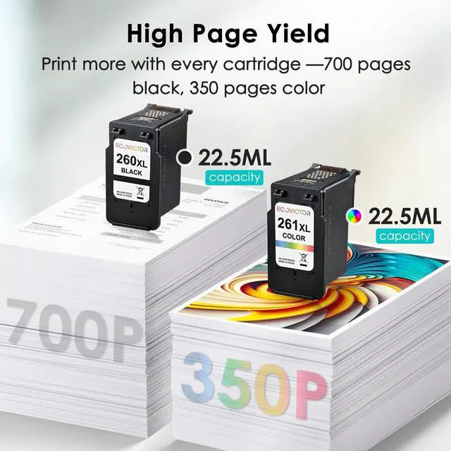 ^^ High Yield: Eco Victor ink 260 and 261 cartridges have a page yield of up to 700 pages per pg-260 black ink cartridge, and 350 pages per cl-261 color ink cartridge (depending on printer and usage).