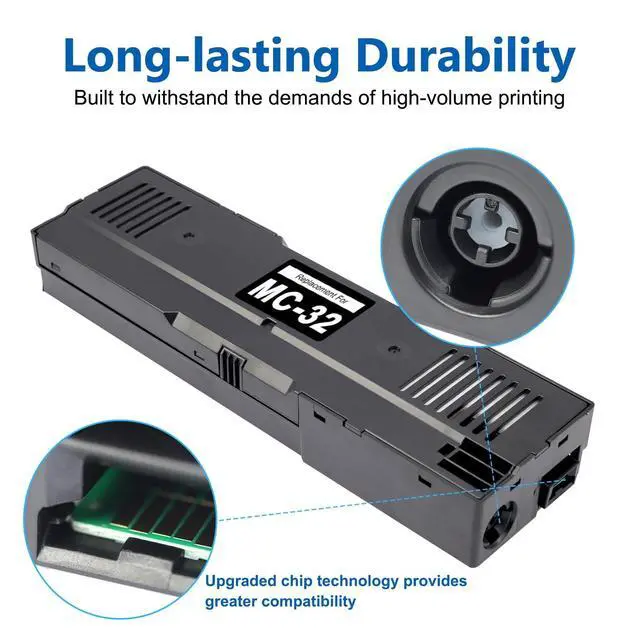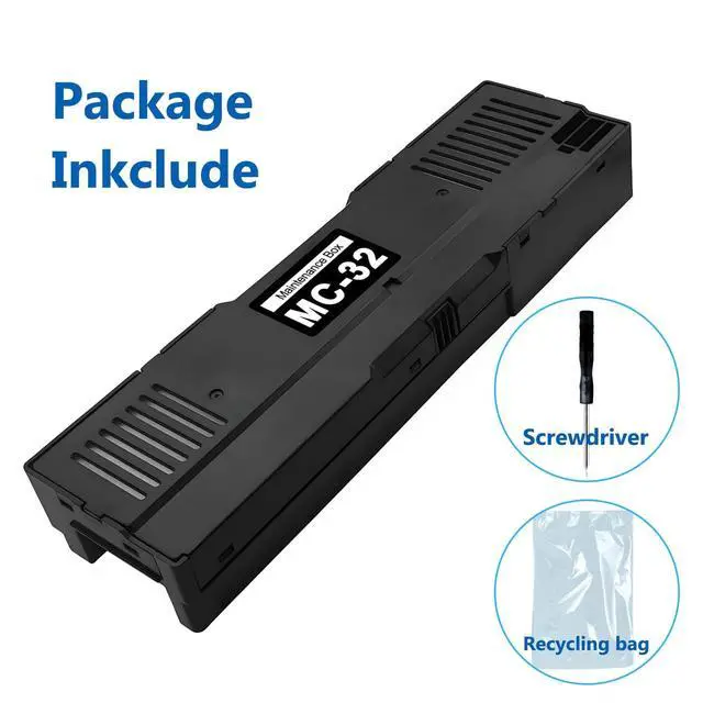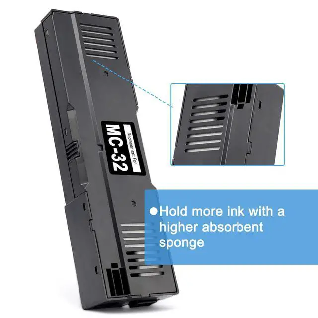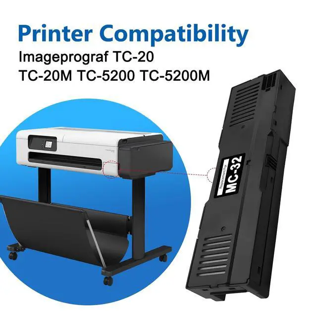 Compatible modelThe MC 32 maintenance cartridge replacement compatible with Canon imagePROGRAF TC-20 TC-20M TC-5200 TC-5200M wide large format printers ^^ High QualityThis MC32 waste ink cartridges maintenace tank is designed to handle frequent ink absorption and can be relied upon for extended periods of use. Easy to use, and won't ruin or block the print head ^^ Easy to InstallThis MC 32 maintenance cartridge adopts the latest chip technology and strong adsorption sponge. Easy to install. Built-in sponge pad can perfectly absorb waste ink to prevent ink overflow ^^ Durable Design The durable design of the MC-32 cartridge ensures long-lasting performance and protection for the printer.