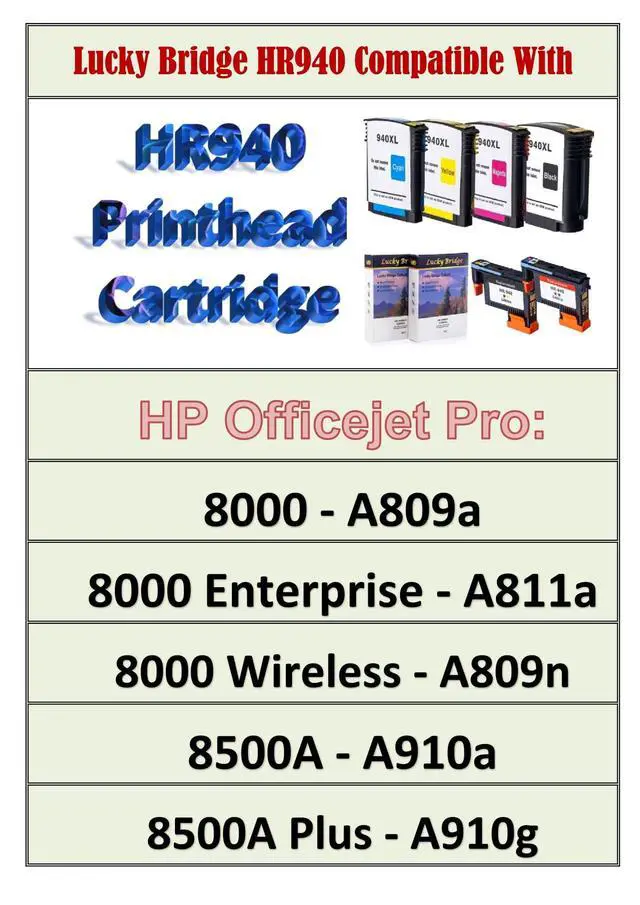 Included: 1xBlack/Yellow, 1xCyan/Magenta (2Pcs Printheads, 1 BY / 1 MC, and 1 set of 940XL Ink Cartridges (BK/C/Y/M) C4900A / C4901A, 2 pcs Printheads / 4 Pcs of Ink Cartridge100% compatible with the following printers:.