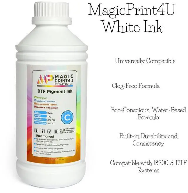 Upgrade your print quality with our MagicPrint4U DTF Pigment Ink the trusted choice for apparel decorators, DTF print shops, and creators looking for reliable performance and high-impact results. Whether you're running a commercial operation or an advanced home setup, this 1000ml white DTF ink bottle delivers crisp, vibrant, and wash-resistant prints on a wide range of garments. Our ink is specially developed for direct-to-film printing, a process that demands precise ink formulation to avoid clogs, uneven coverage, or color fading. This high-opacity white ink lays down strong underbases that make your colors pop even on dark or blended fabrics.