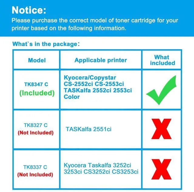 Reliable Quality: LCL TK8347 cartridge uses high quality toner, toner particle size distribution, good mobility, high transfer rate, resulting in a clear image and high gloss print effect; Printing efficiency is high, waste powder rate is low, so as to ensure sufficient page yield.