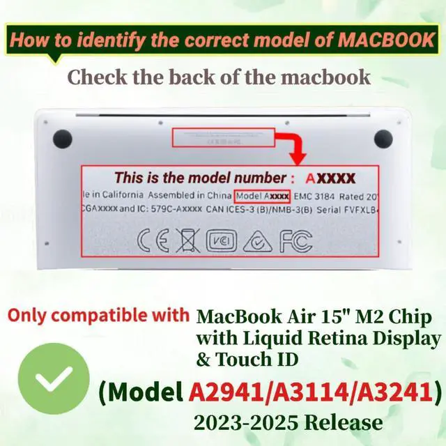 Laptop: Please kindly check the model number "Axxxx" on the back of the laptop before your purchase, "XXXX" is a numeric number. MacBook Air 15 Inch model A3241 A3114 M3/ A2941 M2