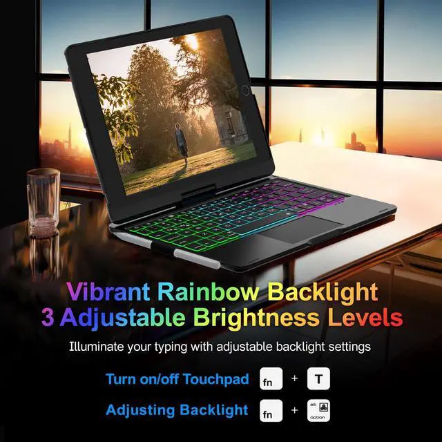 Rainbow Backlit: Illuminate your workflow with vibrant rainbow backlight, iPad 8th generation case with keyboard features 3 adjustable brightness levels. You can customize brightness and backlight color to suit your preferences and habits. Enjoy a sleek and stylish setup with Baisla iPad 9th generation keyboard case with pencil holder ^^ Full Protection & Smart
